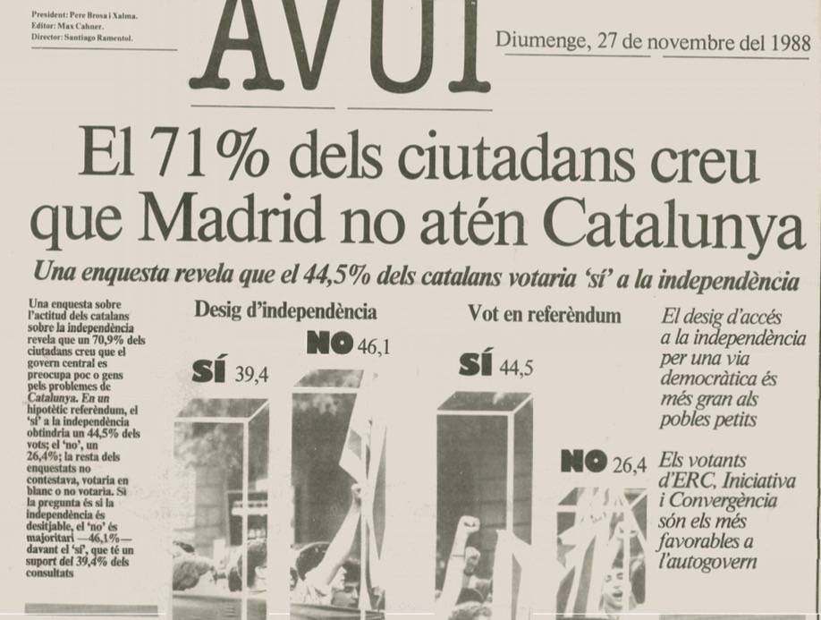 Tal dia com avui de 1989 el Parlament de Catalunya va aprovar una moció en què expressava que no renunciava al dret a l'autodeterminació del poble català.