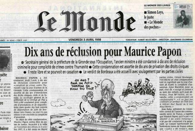 1998 Maurice Papon és condemnat a 10 anys de presó per haver col.laborat amb l'ocupació nazi i l'extermini