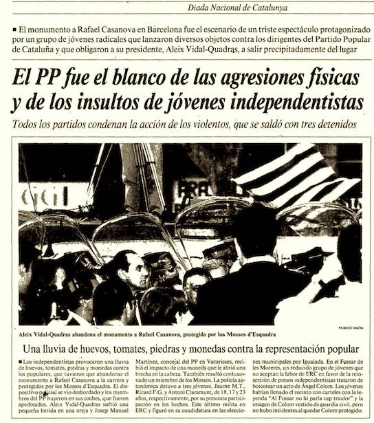 1999 Condemnes pel rebuig als representants del PP durant la Diada Nacional de Catalunya del 1995 al monument a Casanovas