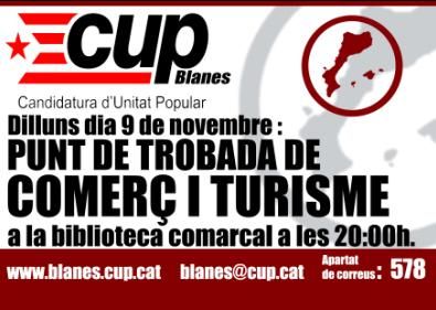 Aconseguir una correcta planificació de les activitats econòmiques i la gestió dels territori des d'una perspectiva de progrés i de transformació social. Aquest era el gran objectiu del Punt de Trobada de Comerç i Turisme que la Candidatura d’Unitat Popular (CUP) de Blanes va celebrar el passat dia 9 de novembre.