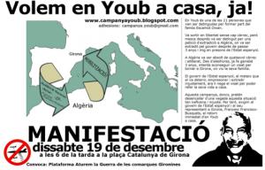La Plataforma Aturem la Guerra ha iniciat una nova campanya perquè en Youb pugui tornar a Salt. L'entitat està recollint mostres de suport i aquest dissabte 19 de desembre ha organitzat una manifestació a Girona que sortirà de la plaça Catalunya de Girona a les 6 de la tarda.