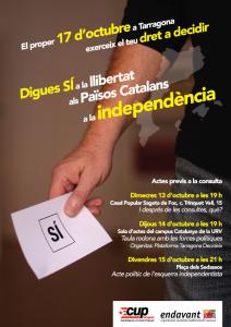 El dia 17 d'octubre Tarragona celebra la seva consulta independentista juntament amb altres poblacions. En aquest sentit, la CUP de Tarragona, que ja fa dies que fa campanya pel "sí" i el conjunt d'organitzacions de l'Esquerra Independentista han organitzat activitats per tal d'implicar gent que pertany a partits o a organitzacions polítiques, però sobretot gent que no s'havia mogut, fins a la data, gairebé per a res, a causa de la desafecció.