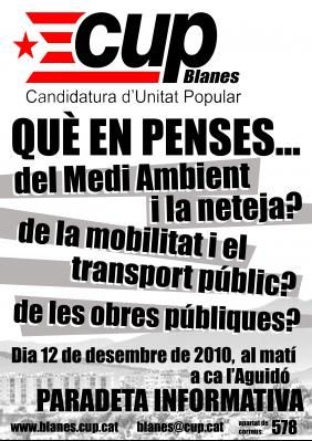 La Candidatura d’Unitat Popular (CUP) de Blanes segueix endavant amb els seus punts d'informació ciutadana al carrer per tal de recollir propostes per la ciutat. En aquest sentit, anuncien que tornen a sortir al carrer per a instal·lar-hi una paradeta informativa aquest diumenge 12 de desembre.