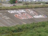 Ahir al matí, militants de l'Assemblea de l'Horta d'Endavant (OSAN) han realitzat un mural d'uns vint i cinc metres d'amplada al llit del riu Túria amb el lema "Capitalisme és crisi" acompanyat per unes grans tissores tat.