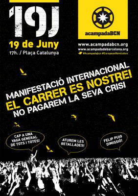 L'acampada de Barcelona ha fet una crida a manifestar-se de forma massiva, festiva i no violenta que se celebrarà simultàniament a centenars de ciutats de tot el mòn. La manifestació està convocada per les assemblees de barris, pobles i viles de Catalunya.