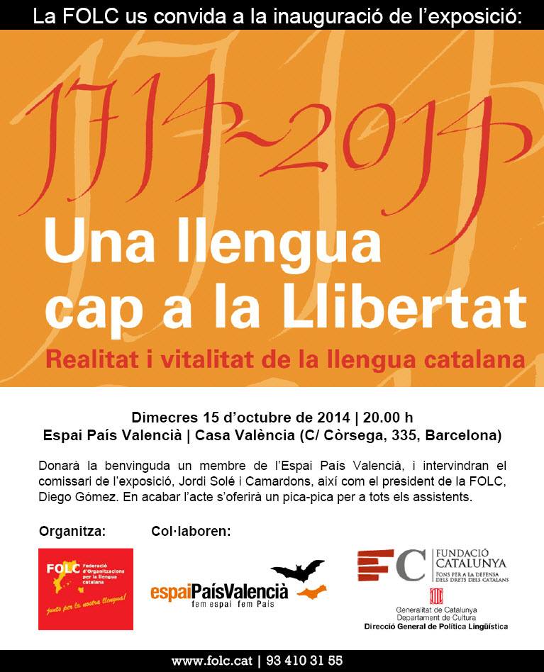 L'acte comptarà amb les intervencions de Diego Gómez, President dela Federació d’Organitzacions per la Llengua Catalana (FOLC) , i Jordi Solé i Camardons, comissari de l'Exposició.