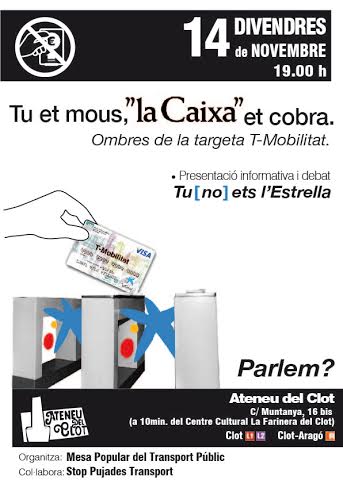 Stop Pujades i la Mesa Popular del Transport Públic organitzen una xerrada informativa pel proper divendres a les 19h a l'Ateneu del Clot (c/ Muntanya, 16bis). La xerrada consistirà en una exposició sobre la T Mobilitat, la nova iniciativa privatitzadora de l'Autoritat del Transport Metropolità que cedirà a La Caixa els drets sobre el transport públic.