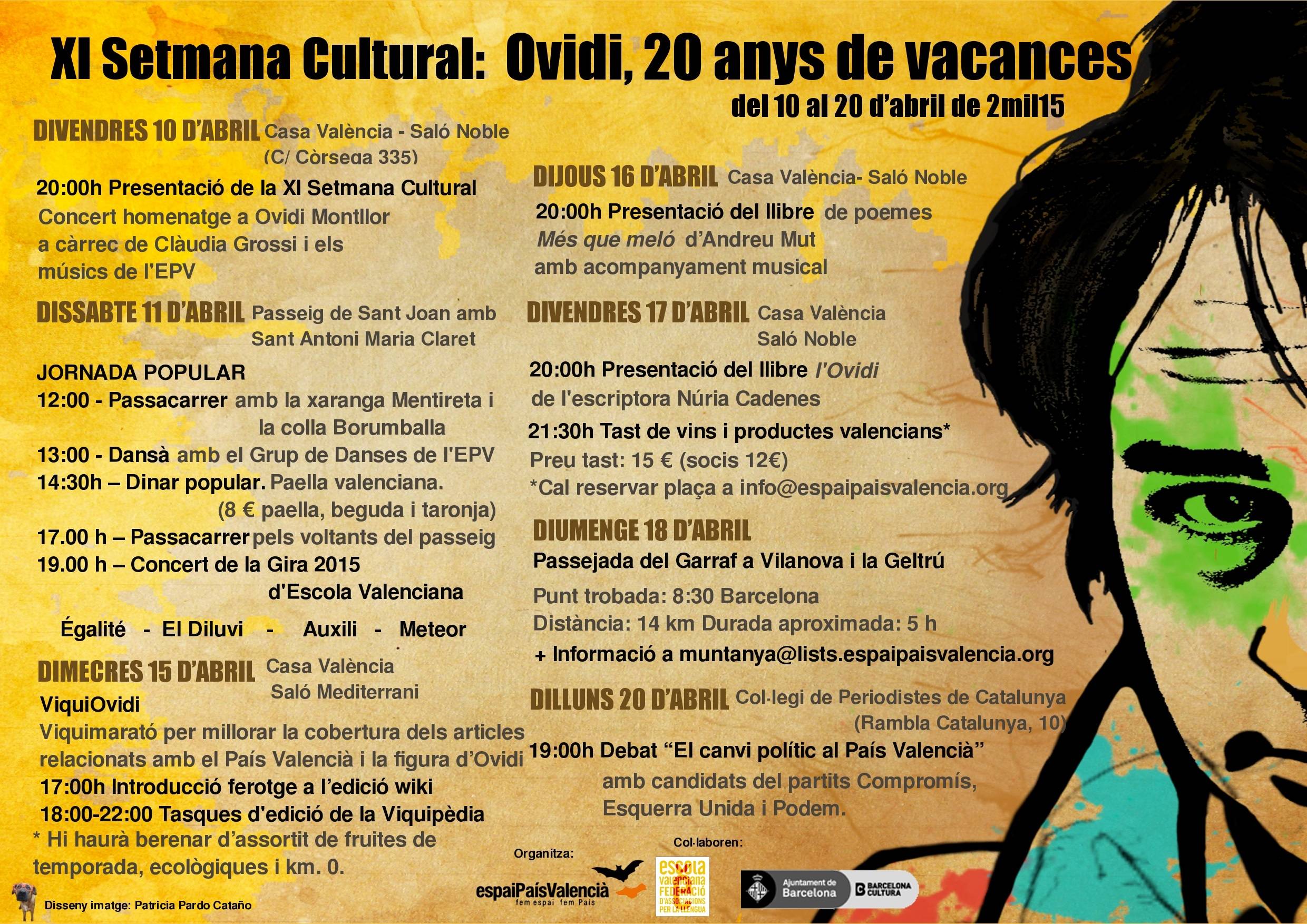 Amb la presentació de l'XI Setmana Cultural de l'Espai País Valencià a Barcelona (EPV), divendres passat, es va donar el tret de sortida d'una llarga setmana farcida d'activitats. El mateix dia hi va haver un concert d'homenatge a l'Ovidi a càrrec de Claudia Grassi, Pau Benavent i els músics de l'EPV.