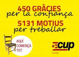 La CUP Alcover entra amb força a l'Ajuntament amb 450 vots i obté 3 regidors. "És per això que agafem aquest compromís que ens anima a continuar teixint poc a poc, dia rere dia, el canvi social i nacional des de baix",  assenyala la formació en la seva pàgina web.