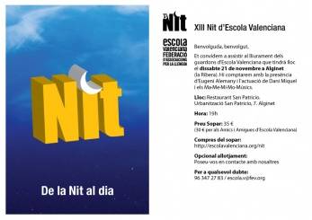 El proper dissabte tindrà lloc la XIIIa Nit d'Escola Valenciana a la Ribera, concretament, els Salons San Patricio del municipi d'Alginet seran el centre d'una de les activitats més emblemàtiques de l'entitat cívica que premia, d'una banda, la tasca de persones i col·lectius que treballen per assolir la normalització lingüística i, d'altra banda, és el context en el qual es presenta la imatge de les Trobades.