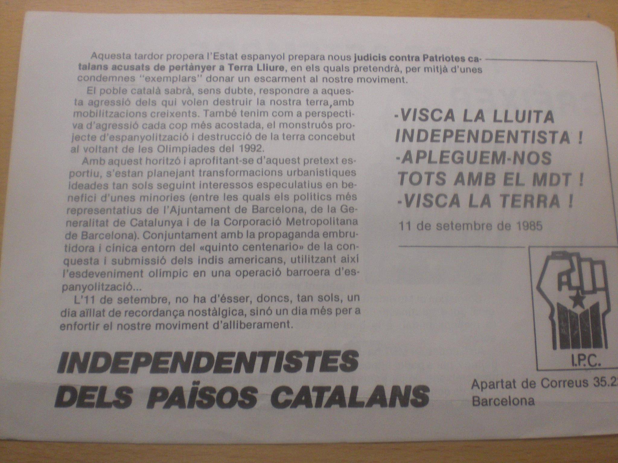 El matí de l’Onze de Setembre de 1985 entre deu i quinze mil persones convocades pel Moviment de Defensa de la Terra s’aplegaren al Fossar de les Moreres i al Passeig del Born on s’inicià l’acte polític amb els parlaments de Manuel Forcat (MDT), Antònia Jornet (MDT) i Jon Idigoras (Herri Batasuna). Al míting també intervingueren Josep Mª Cervelló (Comitès de Solidaritat amb els Patriotes Catalans, CSPC) que va recordar els presos Jaume Fernàndez, Carles Sastre i Montserrat Tarragó detinguts el gener d’aquell any juntament amb altres independentistes i Vicent Partal (MDT) que va afirmar que la repressió no podria acabar amb el moviment independentista. Durant l’acte per megafonia es va poder escoltar diverses vegades el cant de Els Segadors i les cançons del disc “Visca la Terra” (disc publicat aquell mateix dia pels CSPC que es venia a les parades del Fossar).