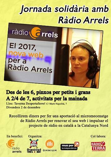 El Casal Despertaferro de Reus, l’Assemblea Nacional Catalana i Òmnium Cultural, i comptant amb la col·laboració de Ràdio Terra, hem organitzat per aquest proper divendres 2 de desembre una jornada solidària amb Ràdio Arrels, l’única ràdio en català de la Catalunya Nord. Segons diuen els convocants, la seva intenció és ajudar-los alhora que demostren amb petits grans gestos que el Tractat del Pirineus s’esfondra poc a poc mentre anem creant un marc comunicatiu propi pels Països Catalans