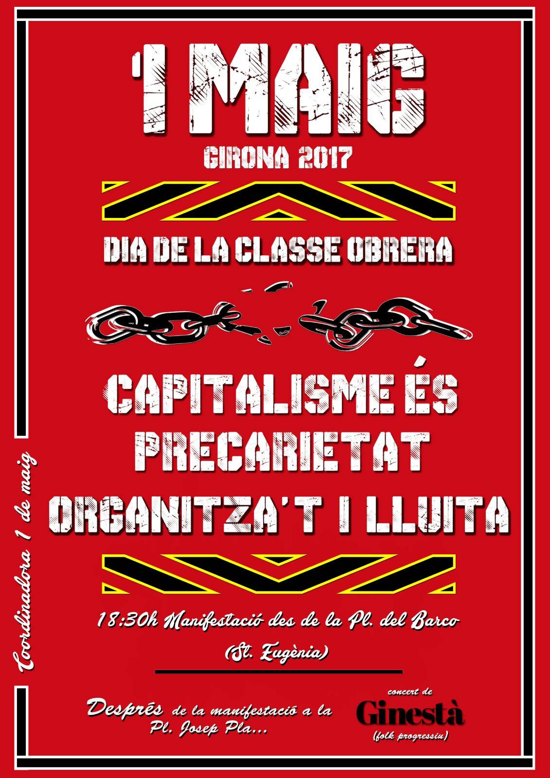 La Coordinadora 1 de Maig, que agrupa diverses organitzacions sindicals, socials i polítiques gironines, ha fet pública la convocatòria de la manifestació anticapitalista i rupturista a Girona amb motiu de l’1 de maig, dia de la classe treballadora. Sota el lema “Capitalisme és precarietat: organitza’t i lluita”, la marxa s’ha convocat a les 18.30h a la plaça del Barco de Santa Eugènia.