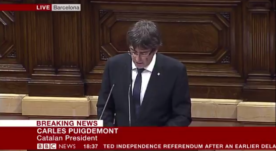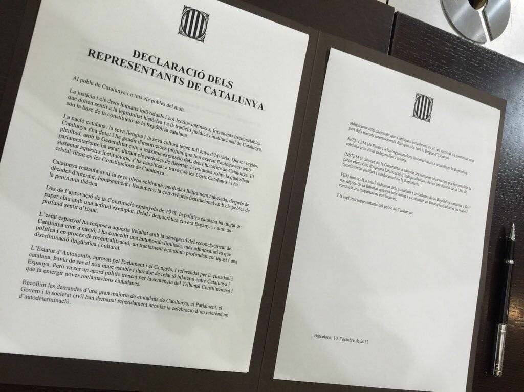 El president de la Generalitat, Carles Puigdemont, ha donat a conèixer els resultats del referèndum al Parlament amb la intenció d'implementar-los pel seu caràcter vinculant, tot dient que Catalunya esdevé una estat independent en forma de república. Ara bé, tot seguit el president ha demanat al Parlament, en nom propi i del Govern, "la suspensió als efectes de lad eclaració d'independència per tal que en les properes setmanes emprenguem un diàleg sense el qual no és possible arribar a una solució acordada". Puigdemont ha justificat aquesta postura emperant-se en les crides al diàleg que l'executiu català ha rebut en l'àmbit català, espanyol i internacional.