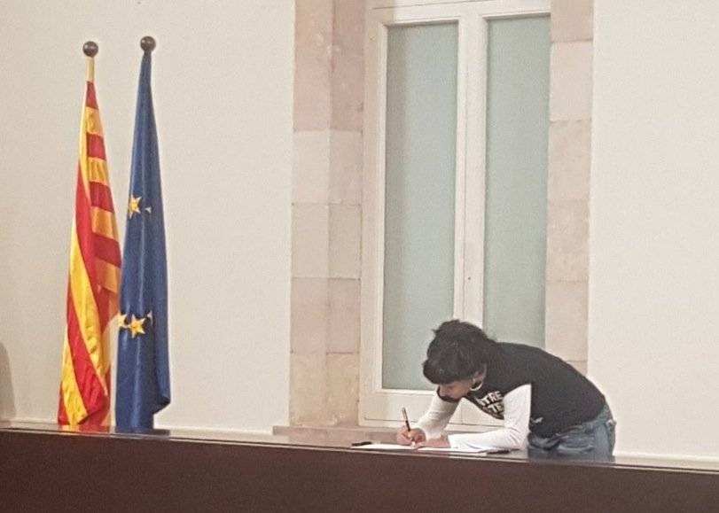 Els membres del Govern i els diputats i diputades de Junts Pel Sí i la CUP han firmat un darrere l'altre la Declaració d'Independència que estableix la creació de la República Catalana i explicita la voluntat de formar part el més aviat possible de la comunitat internacional.