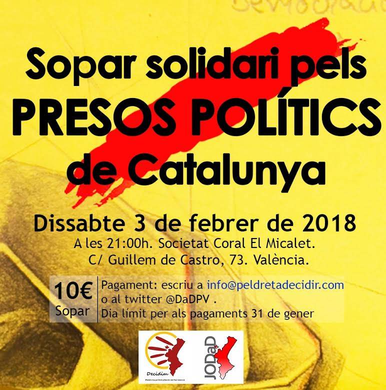 La Plataforma pel Dret a Decidir del País Valencià (PDaD – PV) ha organitzat sopar solidari pels presos polítics de Catalunya. L’acte tindrà lloc el dia 3 de febrer de 2018, a les 21.00 hores, al bar-restaurant de la Societat Coral el Micalet situat al carrer Guillem de Castro, 73 de la ciutat de València.