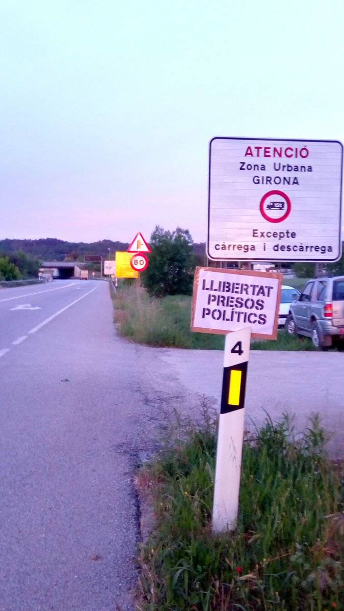 Els CDR de l'Empordà, Nord-oriental i del Vallespir han posat aquesta matinada milers de cartells reivindicatius al llarg de la N-II des de La Jonquera (Alt Empordà) fins a Tordera (Alt Maresme) en contra de la monarquia, en defensa dels presos polítics, en favor dels drets socials i polítics i en contra de l'Estat espanyol.