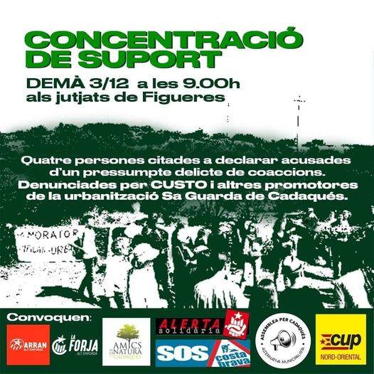 Diverses organitzacions polítiques i entitats ecologistes han convocat una concentració als Jutjats de Figueres en suport de 4 veïns de Cadaqués que han estat citades a declarar per per protestar contra l'inici il·legal de les obres de la urbanització Sa Guarda.