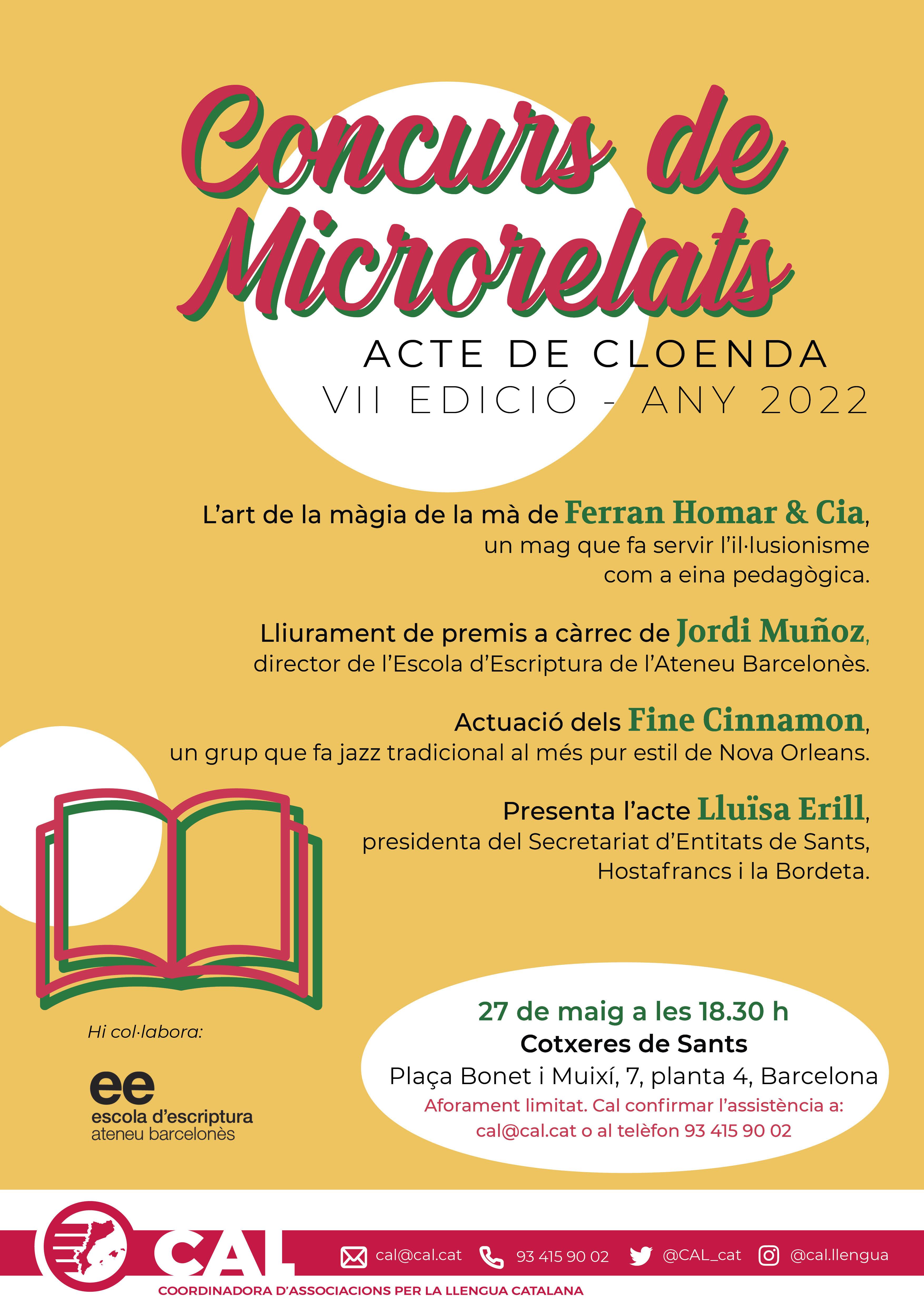 El proper divendres 27 de maig tindrà lloc, a les Cotxeres de Sants (plaça Bonet i Muixí 7, Planta 4) l'acte de cloenda de la VII edició del Concurs de Microrelats, que la CAL organitza juntament amb l'Escola d'Escriptura de l'Ateneu Barcelonès, durant el qual es farà el lliurament de premis als guanyadors del certamen.