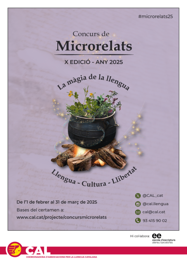 La Coordinadora d’Associacions per la Llengua catalana (CAL), amb la col·laboració de l’Escola d’Escriptura de l’Ateneu Barcelonès, organitzem, de nou, el Concurs de Microrelats, un certamen literari que vol contribuir al foment de l’ús de la llengua catalana a través de l’elaboració de relats breus.