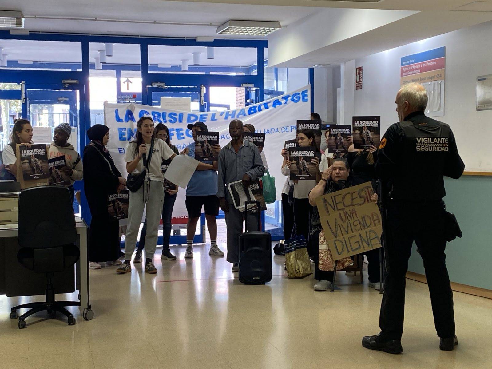 Els membres del Sindicat d’Habitatge que han entrat pacíficament a les oficines de Serveis Socials afirmen que no marxaran fins obtenir una negociació amb els màxims responsables de l’institució. La Noelia aclareix que es tracta d’un acte de protesta que en cap cas vol atacar ni criminalitzar els treballadors socials.