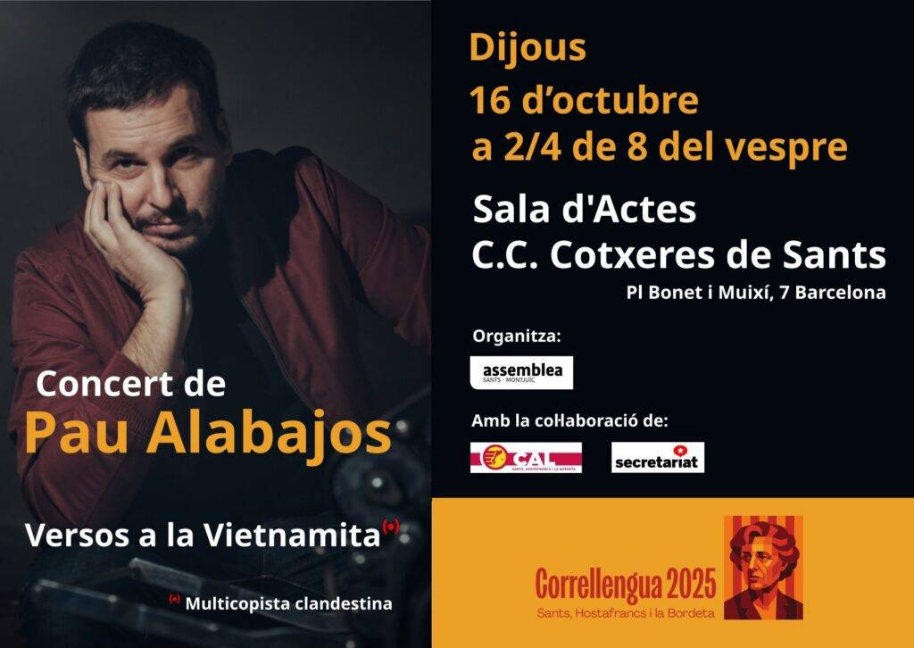 En el marc de la celebració del #Correllengua25 de Sants, Hostafrancs i la Bordeta, dijous 16 d’octubre el cantautor Pau Alabajos oferirà un concert al C.C. Cotxeres de Sants.