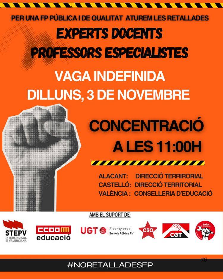 Per tot això, i per exigir la modificació del decret 97/2025 i recuperar les condicions laborals perdudes, el professorat expert i especialista va acordar en assemblea convocar vaga indefinida a partir del 3 de novembre, amb el suport de STEPV, CCOO, UGT, CGT, CSO i el Sindicat d’Estudiants.