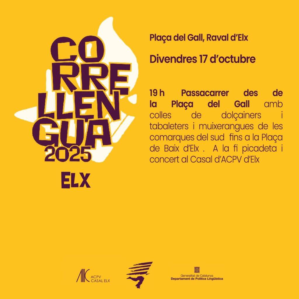 El Casal d’Acció Cultural del País Valencià (ACPV) d’Elx (Baix Vinalopó) ha llançat una emocionant crida a la participació en el Correllengua 2025, una celebració que enguany pren força amb motiu de la Diada Nacional del País Valencià. L’acte tindrà lloc el divendres 17 d’octubre a les 19:00h, amb inici a la Plaça del Gall del Raval, punt de partida d’una cercavila que recorrerà els carrers fins a la Plaça de Baix, davant l’Ajuntament.