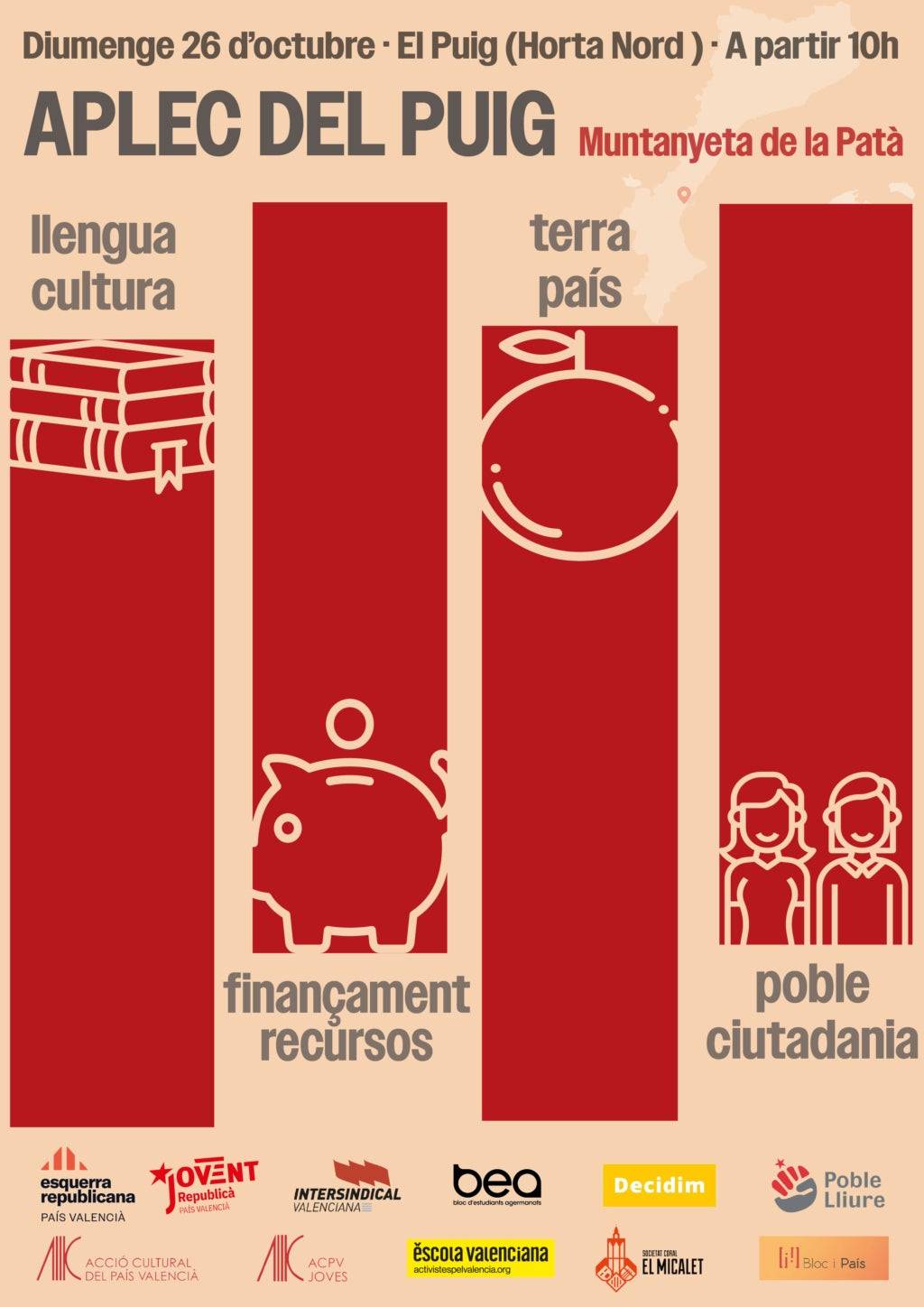 Aquest darrer diumenge d'octubre, 26 d’octubre, la Muntanyeta de la Patà, al terme del Puig (Horta Nord), acollirà una nova edició de l’Aplec del Puig, la tradicional trobada del valencianisme sobiranista que se celebra des de fa més de mig segle. Després de la suspensió de l’any passat, l’Aplec recupera el seu esperit combatiu i festiu sota la convocatòria de diverses entitats que reclamen “més sobirania popular per decidir el futur del País Valencià”.