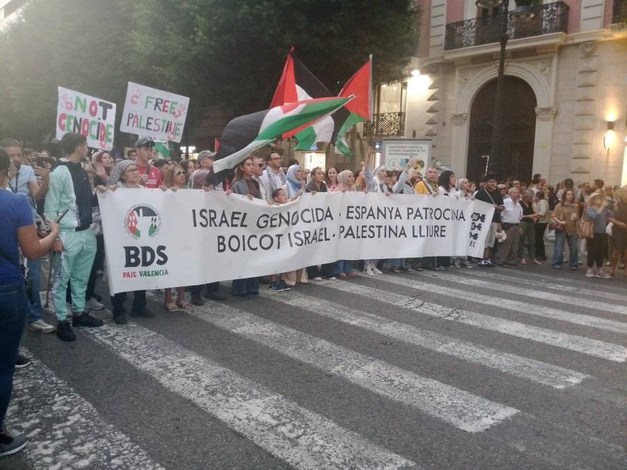 A la vesprada, València va viure una altra mobilització multitudinària, amb més de 20.000 persones segons la delegació del govern espanyol, en una marxa que va recórrer el centre de la ciutat des de la plaça de Bous fins a la plaça d’Amèrica. Sota una pancarta amb el lema “Israel genocida, Espanya patrocina. Boicot Israel. Palestina lliure”, els manifestants van exigir un embargament immediat d’armes i la fi de les relacions comercials i institucionals amb Israel, com a Barcelona.