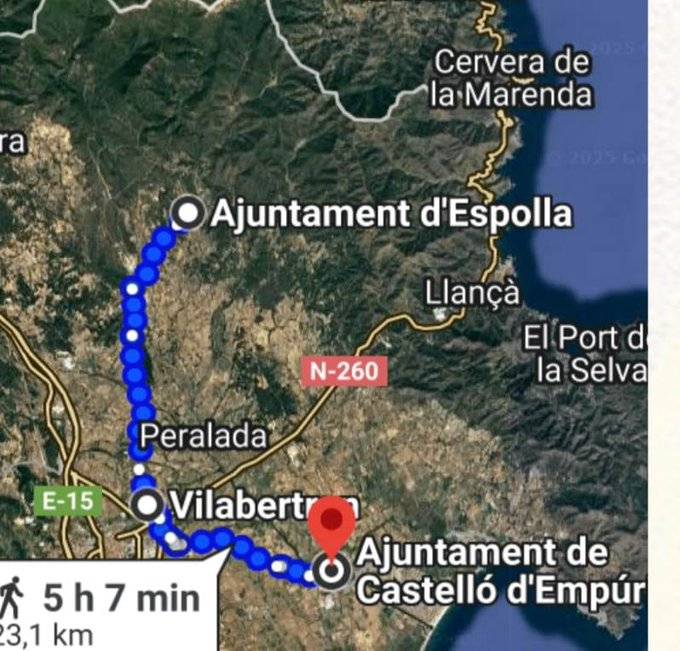 Ahir va travessar l'Albera i va arribar a Espolla en la seva cinquena etapa i aquest matí ha sortit cap a Castelló d'Empúries i arribarà entorn de les 5 de la tarda. Seran rebuts per l'alcaldessa a la Basílica de Santa Maria en un acte de benvinguda que inclourà una breu visita al temple i una recepció institucional. A continuació, els caminants pernoctaran a Castelló abans de reprendre la ruta l’endemà en direcció a Empúries i Girona.