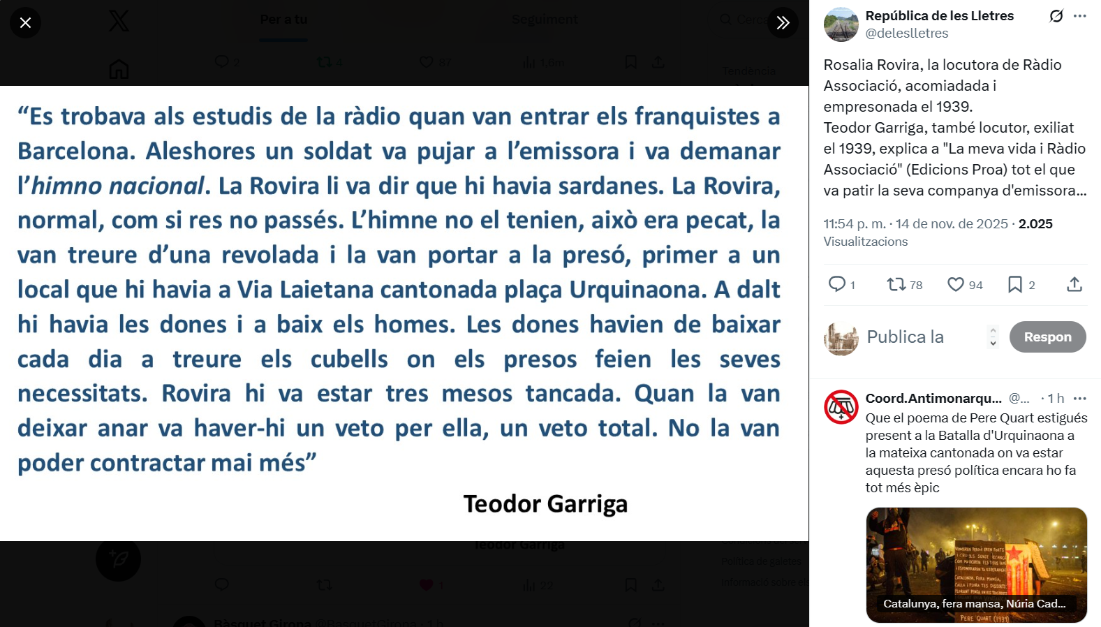 El perfil d’X República de les Lletres ha recuperat aquesta setmana un episodi especialment colpidor. En un missatge dedicat a Rosalia Rovira, locutora de Ràdio Associació de Catalunya, recorden que va ser acomiadada i empresonada l’any 1939, i que va passar tres mesos tancada als soterranis de la Banca Tusquets, a pocs metres d’on avui milers de persones hi passen cada dia sense conèixer aquella història.