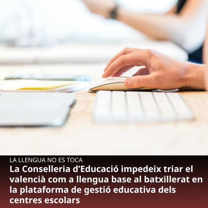 Plataforma per la Llengua del País Valencià alerta d'una incidència greu en l'aplicació de gestió educativa ITACA que, de nou, arracona el valencià en el procés de consulta i aplicació de la llengua base als centres educatius. Diversos claustres, reunits ahir per a aprovar la Programació General Anual (PGA) dels seus centres, han detectat que el sistema impedeix establir el valencià com a llengua base en l'etapa de batxillerat, fins i tot en centres de poblacions valencianoparlants on els resultats de les votacions de les famílies i els percentatges de docència superen àmpliament els requisits. Plataforma per la Llengua reclama a la Conselleria d'Educació, Cultura, Universitats i Ocupació que rectifique immediatament, restituïsca les opcions lingüístiques vulnerades i demane disculpes.