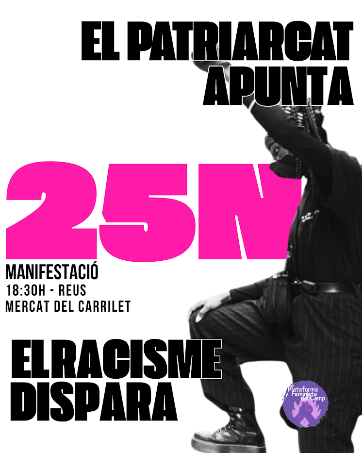 Plataforma Feminista del Camp - La Plataforma Feminista del Camp (PFC) ha convocat una manifestació unitària a Reus aquest dimarts a les 18:30h al Mercat del Carrilet en motiu del dia contra les violències masclistes.  Sota el lema “El patriarcat apunta, el racisme dispara”, criden a reivindicar el feminisme que defensa els drets i llibertats per a totes: “El feminisme és inqüestionablement antiracista. No permetrem que davant d’un feminicidi es busquin les causes en l’origen de qui l’ha comès i s’ignori el patriarcat; i no permetrem que només importin els assassinats quan serveixen per llençar discurs d’odi cap a les persones migrants”.