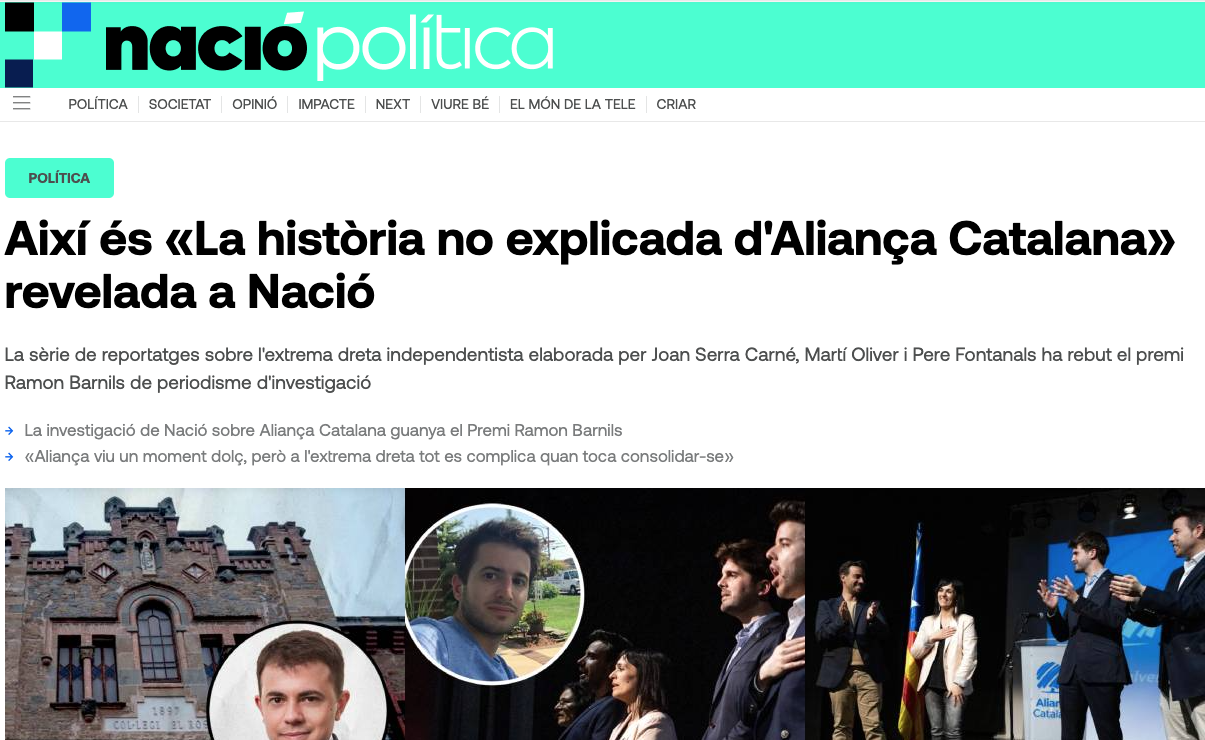 L’onzè Premi Ramon Barnils de periodisme d’investigació, entregat ahir al Born CCM, ha reconegut la sèrie de reportatges La història no explicada d’Aliança Catalana, publicada per Nació. La recerca, signada pels periodistes Joan Serra Carné, Martí Oliver i Pere Fontanals, revela informació inèdita sobre la gestació del partit d’extrema dreta liderat per Sílvia Orriols, així com l’estructura i els recursos que el sostenen.