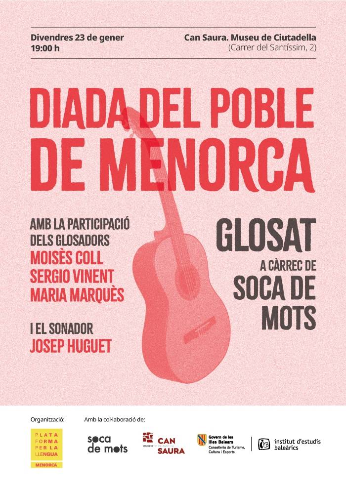 Divendres 23 de gener, Plataforma per la Llengua organitza un glosat a Can Saura. Museu de Ciutadella, per commemorar la Diada del Poble de Menorca.