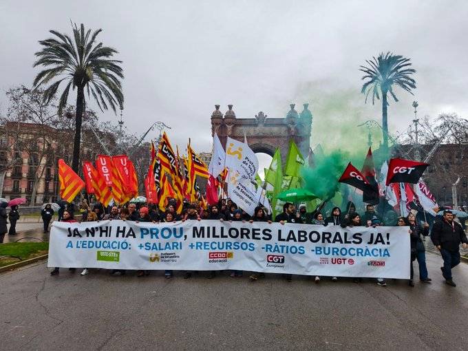 Els sindicats educatius han sortit aquest dissabte als carrers de Barcelona per denunciar la degradació del sistema educatiu i l’incompliment dels compromisos salarials del Departament d’Educació. La protesta, convocada de manera unitària, ha servit també per advertir que la vaga del pròxim 11 de febrer pot obrir un cicle sostingut de mobilitzacions si el Govern no rectifica.