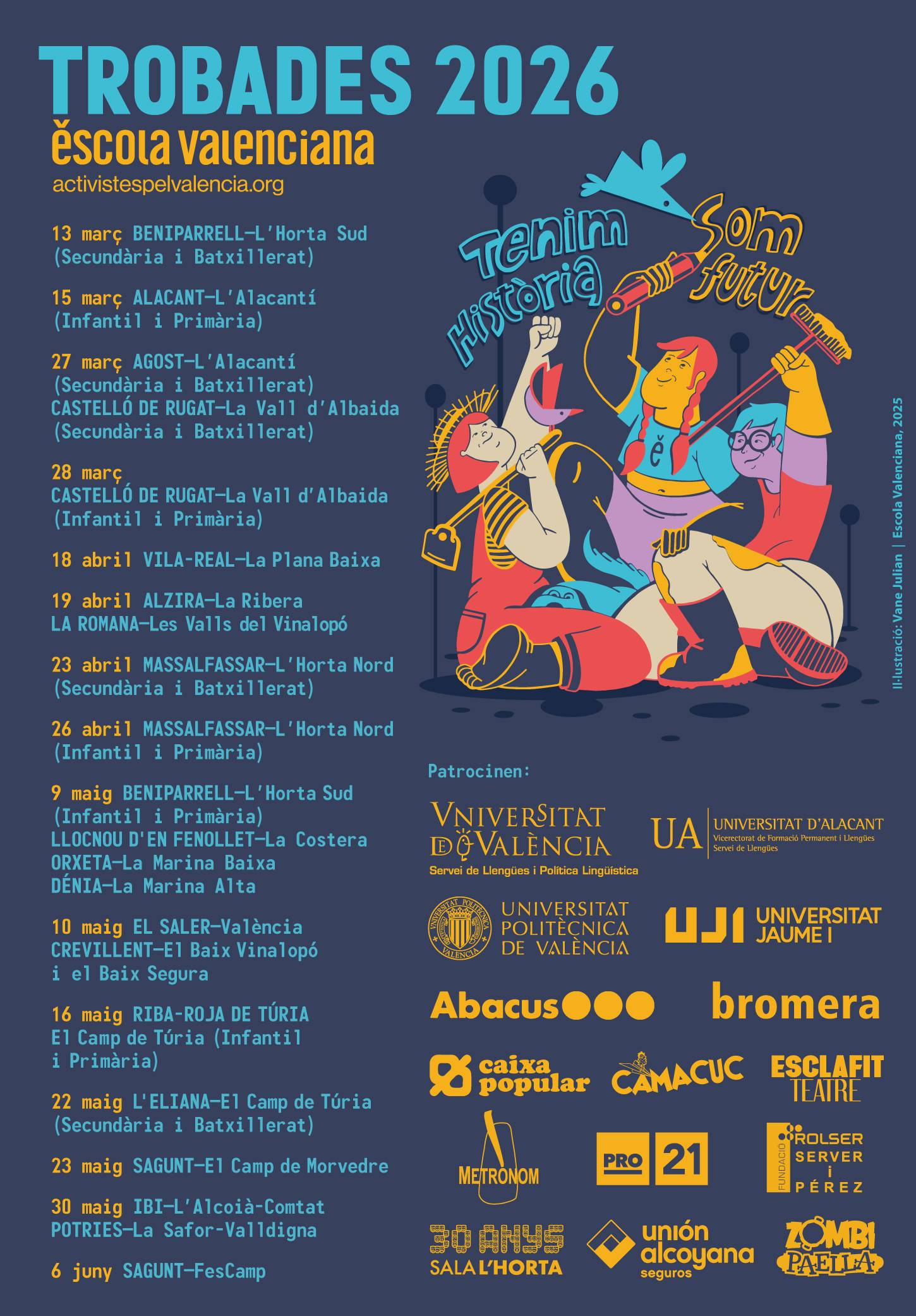 Escola Valenciana va presentar la campanya de les Trobades 2026, que enguany es desplega sota el lema ‘Tenim història, Som futur’, amb un cartell obra de la dissenyadora Vane Julian i amb la cançó oficial ‘Xiulaballariu’, creada pel grup Canta Canalla.