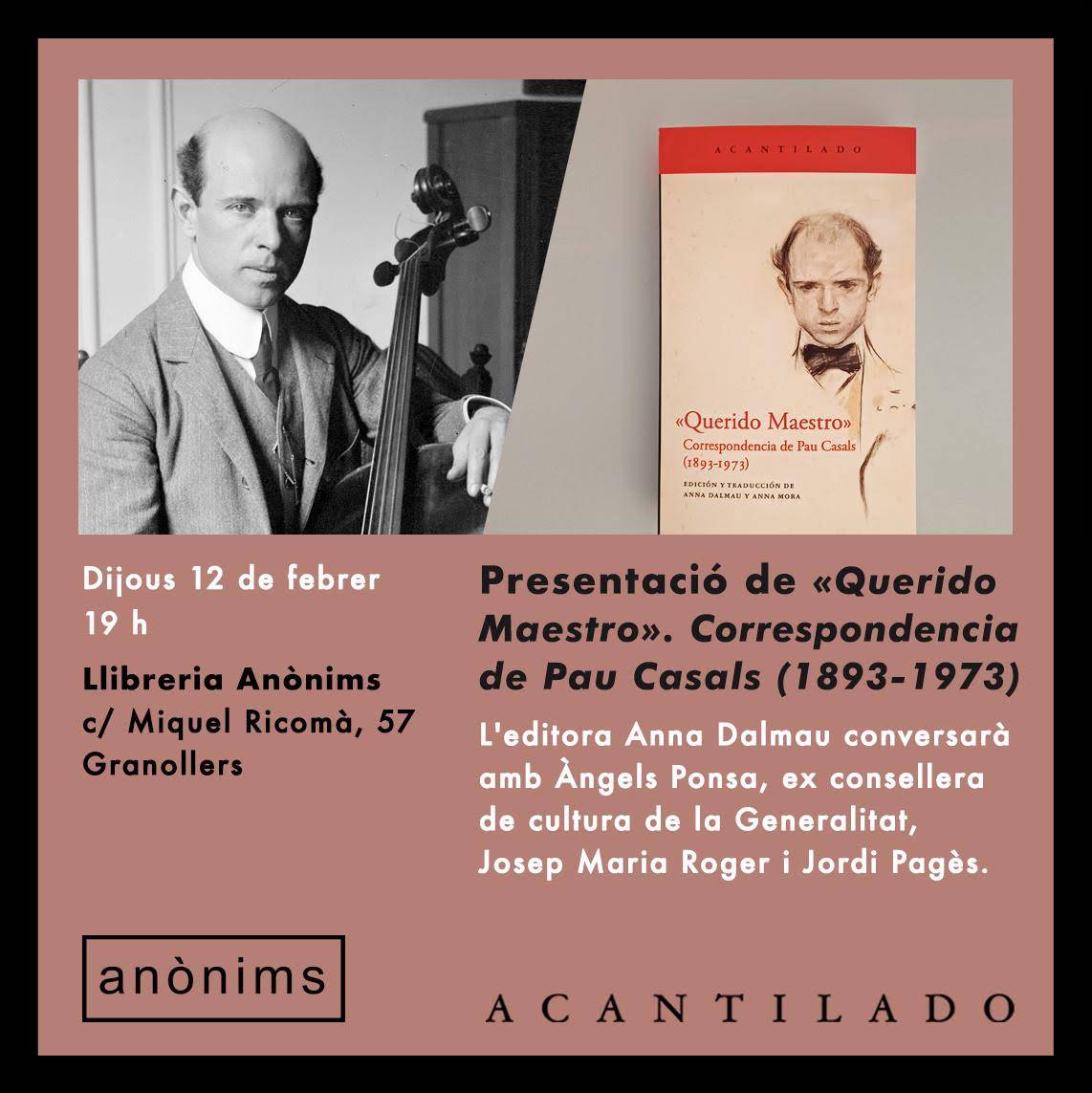 Anònims Ricomà (57 Granollers) acollirà aquest dijous 12 de febrer a les 19 h una nova sessió de les Vetllades poètiques i literàries amb la presentació del llibre «Querido Maestro», un volum que reuneix la correspondència de tota una vida de Pau Casals (1893–1973).