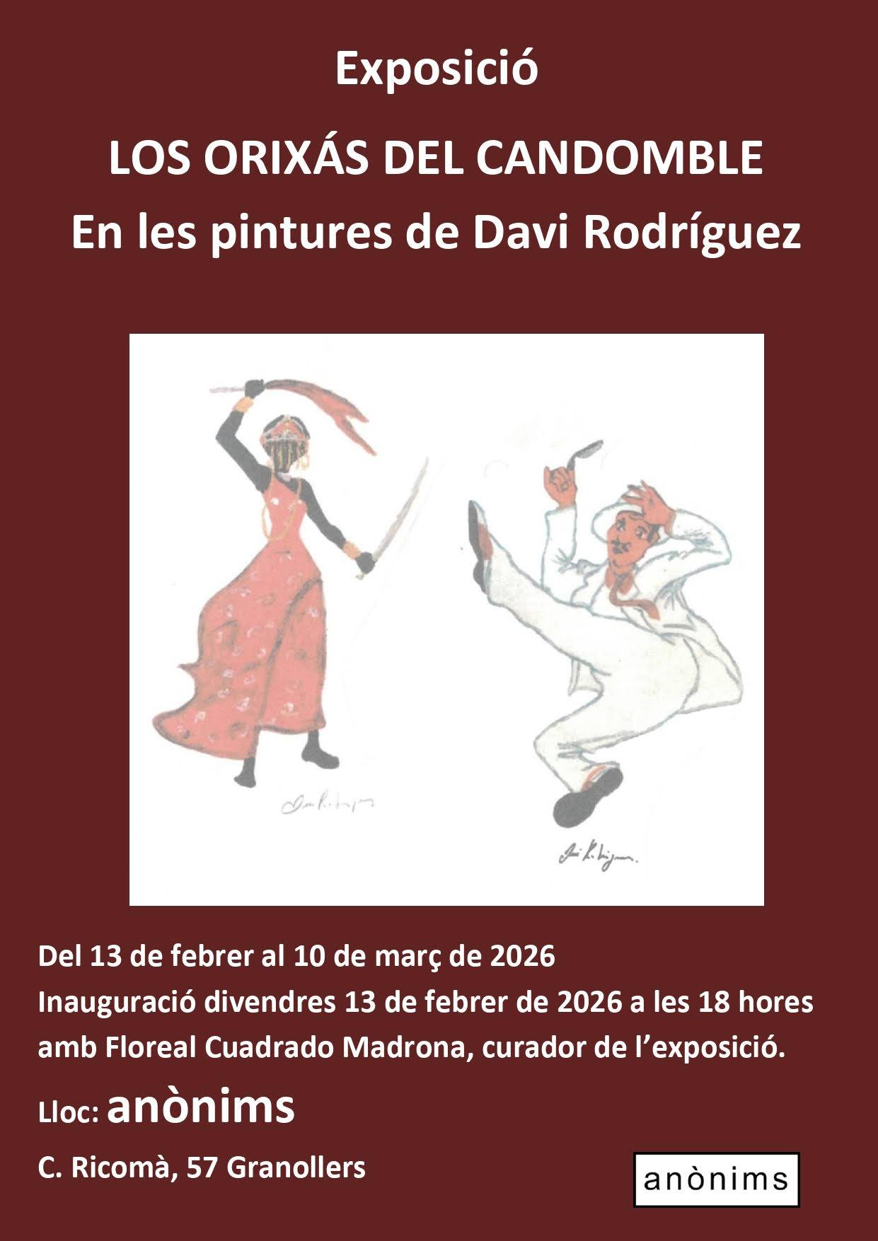 Del 13 de febrer al 10 de març de 2026, l’espai Anònims (C. Ricomà, 57 – Granollers) presenta l’exposició Los Orixás del Candomblé. En les pintures de Davi Rodríguez, una proposta artística que s’endinsa en l’univers simbòlic i espiritual del candomblé brasiler a través de la pintura.