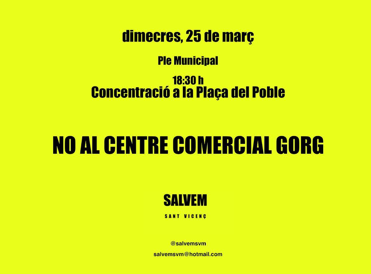 La plataforma Salvem Sant Vicenç ha convocat una concentració aquest dimecres, 25 de març, a les 18.30 h a la plaça del poble, coincidint amb la celebració del ple municipal, per mostrar el seu rebuig al projecte del centre comercial del Gorg.