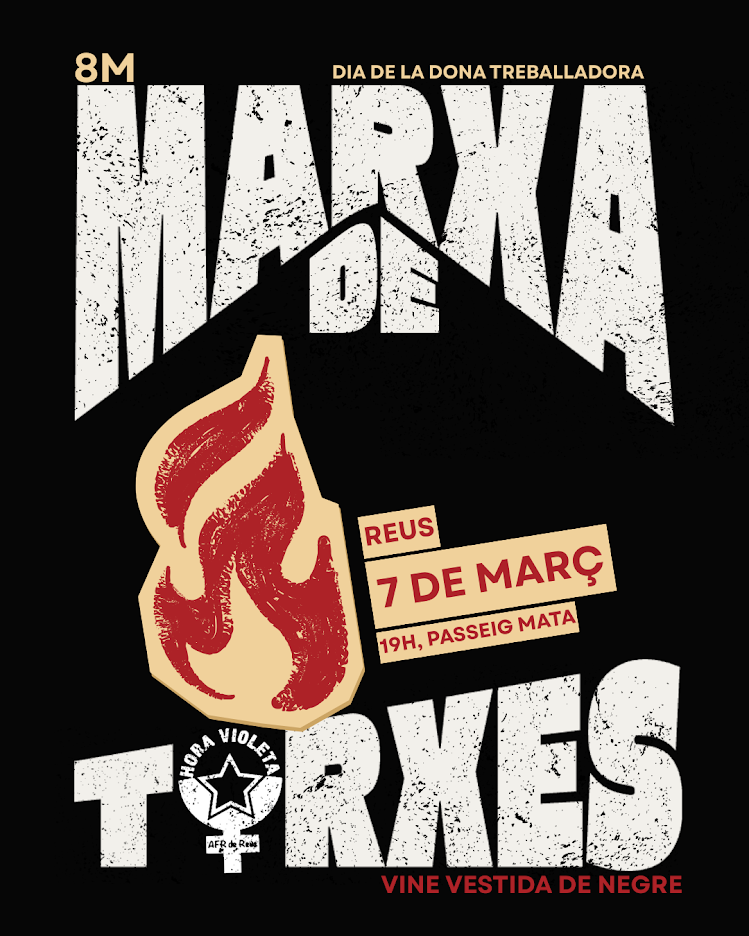 El col·lectiu feminista revolucionari de Reus, l’Hora Violeta, ha organitzat una marxa de torxes el dissabte 7 de març a les 19 h del vespre. Ho fa com a acte previ de la manifestació unitària pel dia de la Dona Treballadora –que es farà el 8 de maç a les 12 h a la plaça Imperial Tarraco– amb l’objectiu de visibilitzar els eixos de lluita del feminisme. És per això que la marxa, que iniciarà al passeig Mata, baixarà pels principals carrers de la ciutat i farà parades a les places més concorregudes, on, en cada una, es llegiran titulars de denúncia, es reivindicaran les principals lluites feministes i cridaran a la mobilització del 8M.