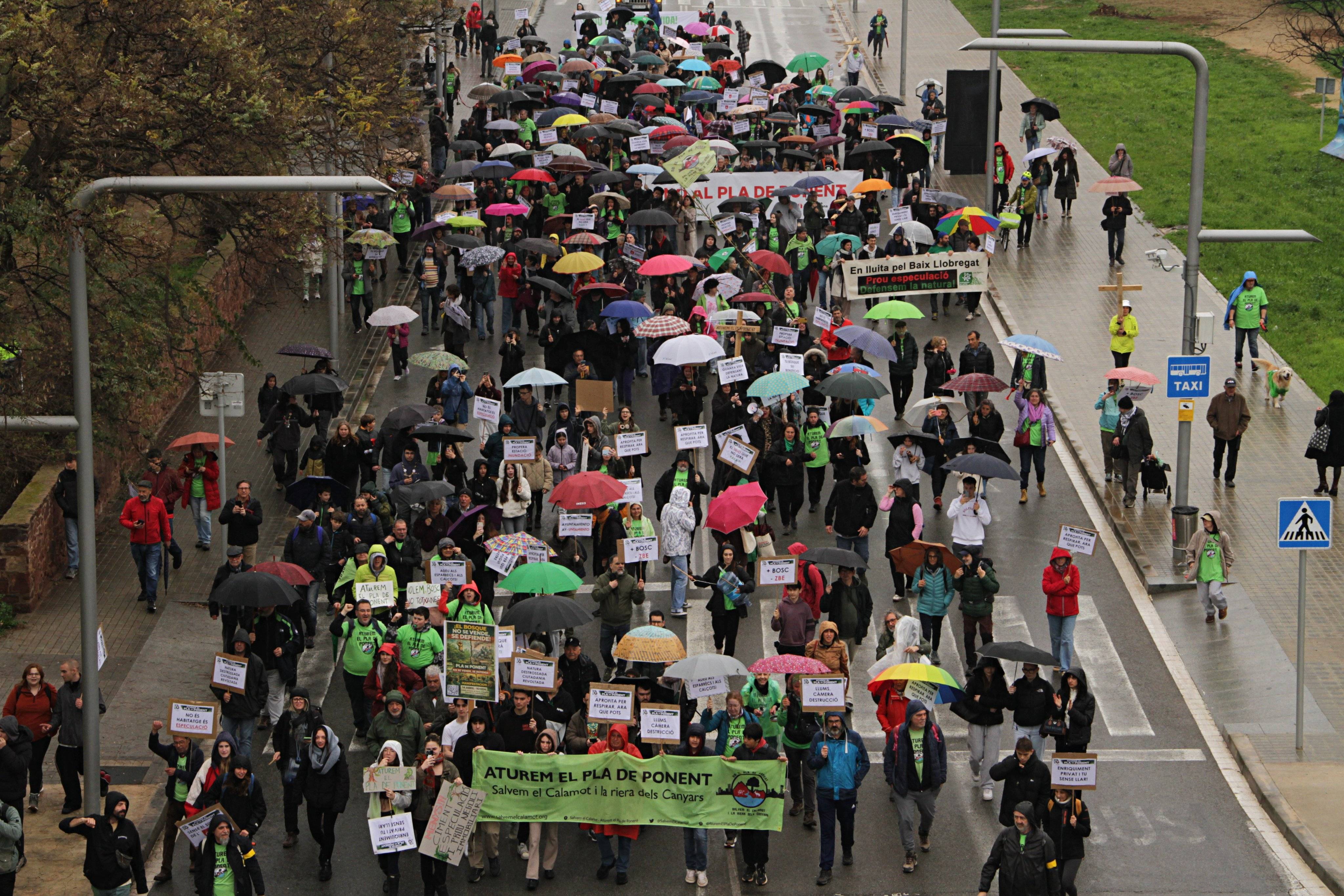 Tot i la pluja, centenars de persones es van manifestar dissabte passat, malgrat la pluja, contra el projecte urbanístic del Pla de Ponent de Gavà, convocades per l’Associació Aturem el Pla de Ponent. La protesta denunciava que el projecte podria destruir l’últim corredor biològic que connecta el massís del Garraf amb el Delta del Llobregat.
