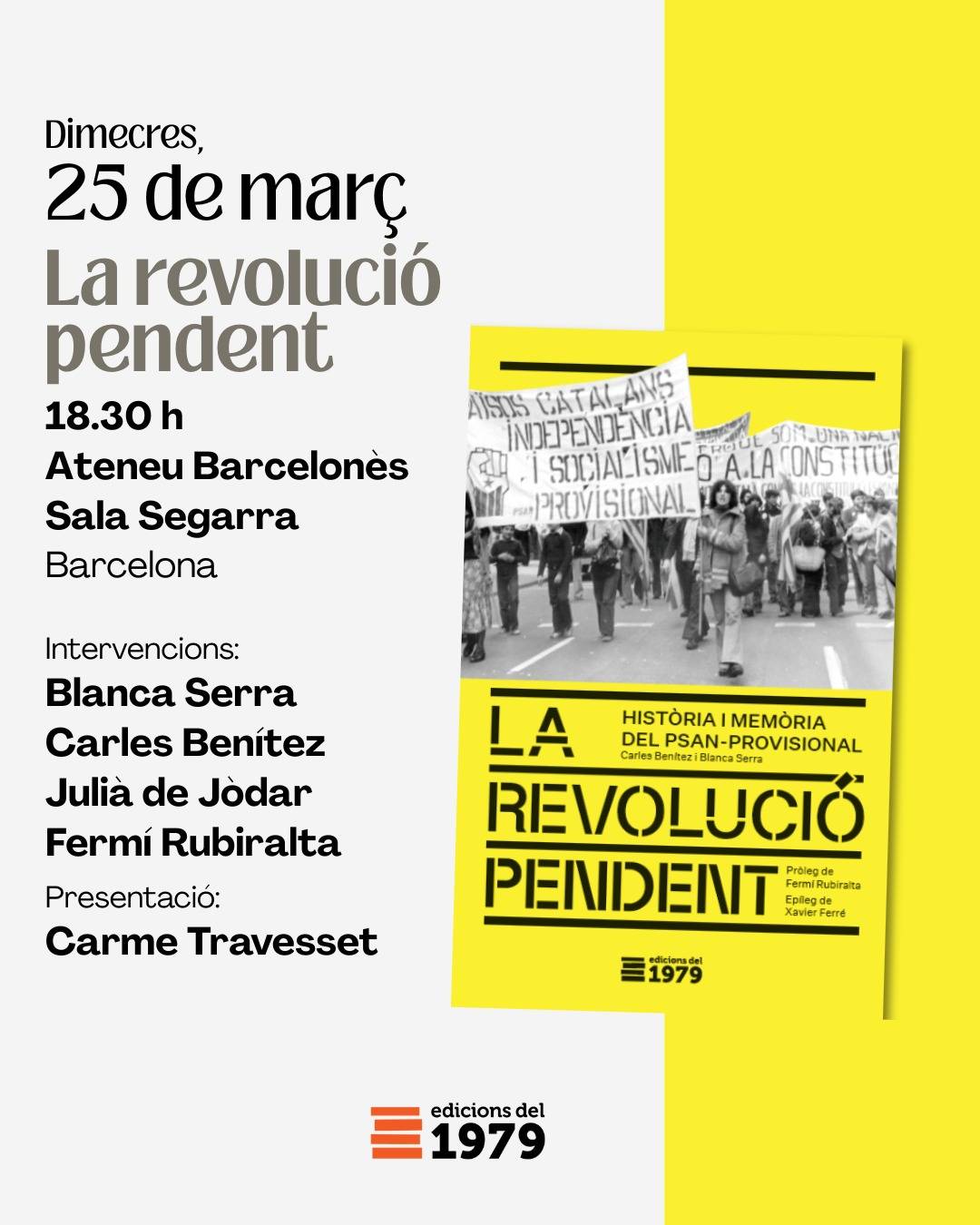 L’Ateneu Barcelonès acollirà aquest dimecres 25 de març, a les 18.30 h, la presentació del llibre La revolució pendent. Història i memòria del PSAN-Provisional, una obra que recupera, des d’una mirada militant, l’experiència del PSAN-P (1974–1978) i la situa en els darrers anys del franquisme i els primers del postfranquisme.