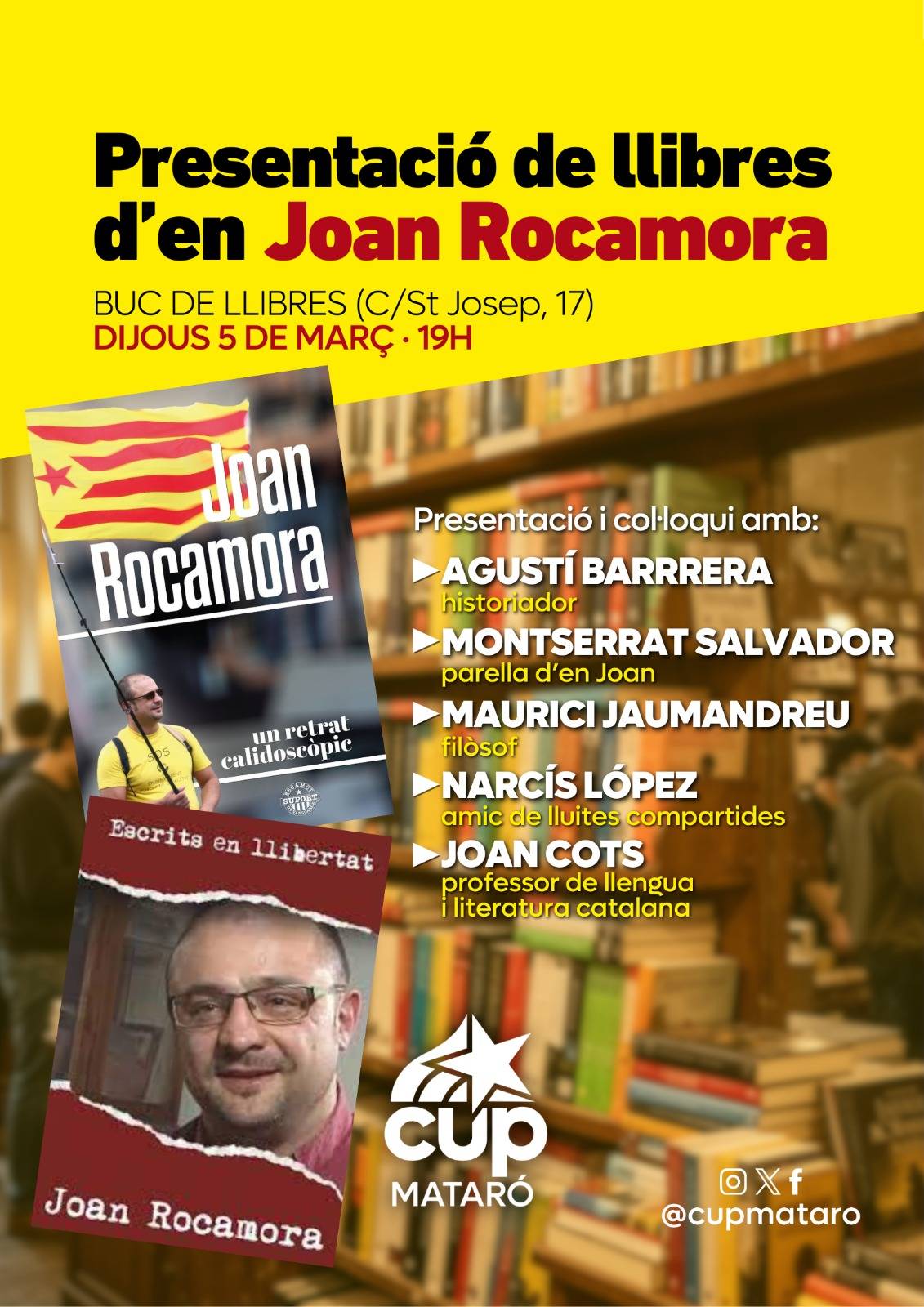 La llibreria BUC de Llibres (C/ Sant Josep, 17) acollirà aquest dijous 5 de març, a les 19 h, la presentació dels llibres Un retrat calidoscòpic i Escrits en llibertat, dues obres que dibuixen el perfil vital, intel·lectual i polític d’en Joan Rocamora, company i un dels fundadors de Llibertat. L’acte és organitzat per la CUP Mataró.
