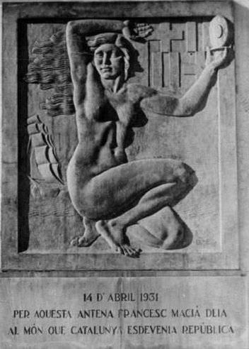 El relleu, finançat per subscripció popular, incloïa originalment una inscripció que recordava aquell moment: que per aquella antena Macià havia anunciat al món que Catalunya esdevenia una República. Durant el franquisme, però, les lletres van ser esborrades, en un intent de fer desaparèixer aquest testimoni de memòria col·lectiva.