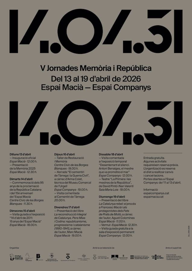 Les Borges Blanques / El Tarròs — L’Espai Macià i l’Espai Companys impulsen del 13 al 19 d’abril les V Jornades Memòria i República, una iniciativa ja consolidada que torna a situar la memòria democràtica i el llegat republicà al centre del debat públic i cultural a Ponent.